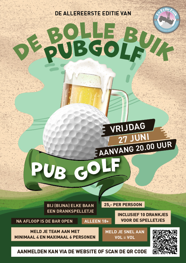 Vrijdag 27 juni is het zover: de allereerste editie van Pubgolf bij De Bolle Buik! Een avond vol lol, drankspelletjes en een flinke dosis competitie op onze midgetgolfbaan. Trommel je vrienden op en geef je op als team!
